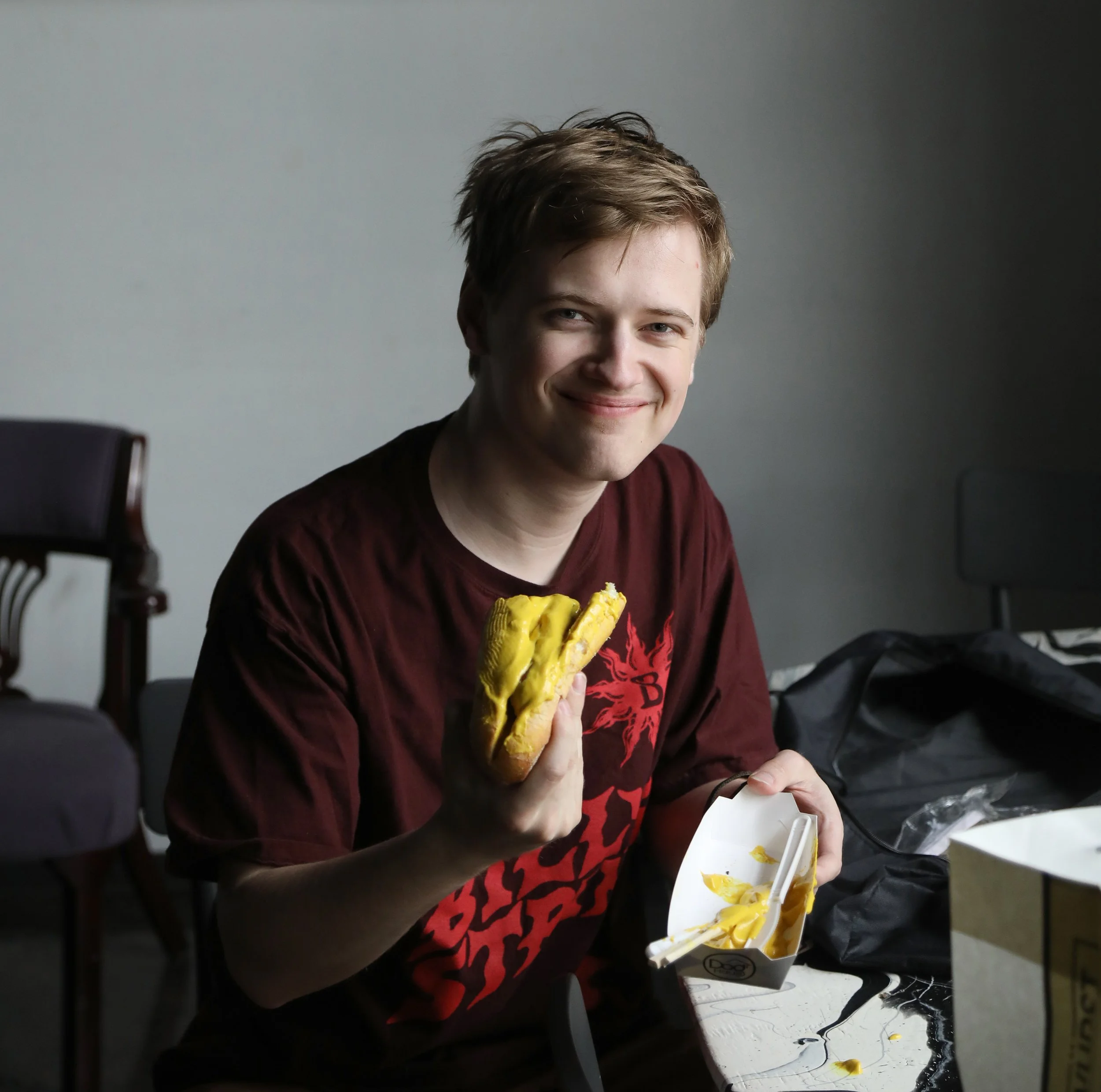 John laughed for a full minute. I felt stupid for not realizing Ian was joking — and that this was actually a great idea. John was all in. We agreed to shoot the next day and bought four hot dogs from the stand down the block. While John ate two, I set up and my son Nicholas came to help. Now it’s time. Standing on a trash bag, John held mustard in his left hand and chopsticks in his right while we shot quickly. You can only put so much mustard on a hot dog before it’s unrecognizable, and John’s right hand must’ve been sore from the chopsticks. When we finished, Nicholas accepted the prop hot dog. After wiping most of the mustard off with a plastic knife, it was good to go, so he sat down to eat.