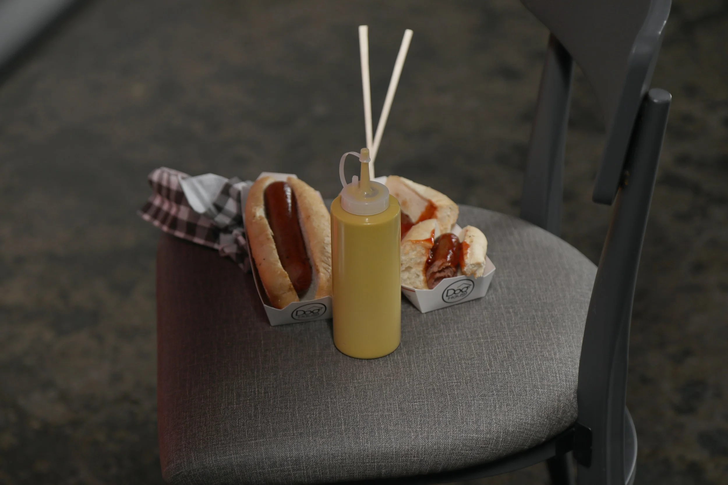 Everything needed for this “sensitive“ photoshoot: hotdogs, mustard and chopsticks